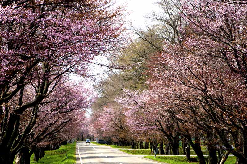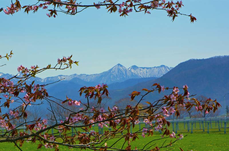 桜並木の向こうには雪を頂いた日高山脈の山々が美しい。