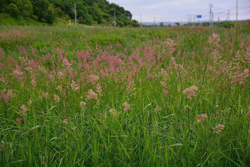 ジャーマンアイリスの向こうに広がる牧草地をよく見ると牧草も花をつけている。