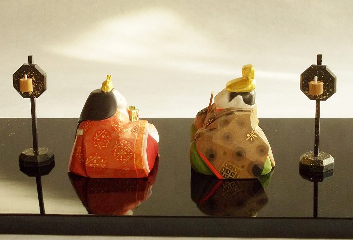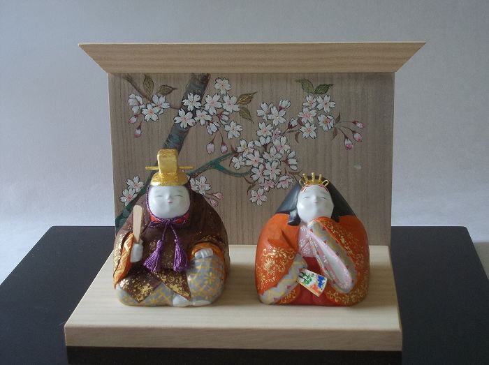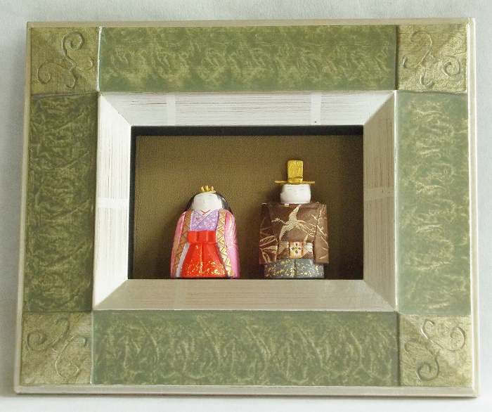 木彫(桂)彩色仕上げ (9x7x8)x2 男びなの烏帽子は金箔を貼りました。なぜだか 女びなより 男雛の方が優しい顔になるのです?