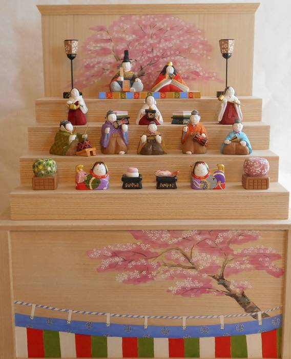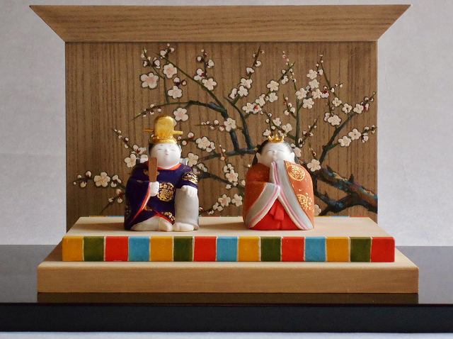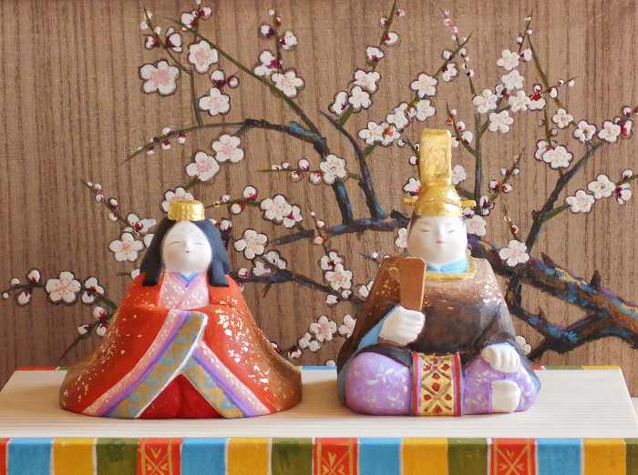 小さな親王飾りです、木彫彩色、バックの絵は梅にしてみました。