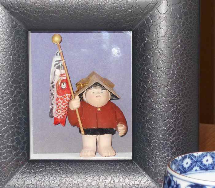 額入り、小さな鯉のぼりを持った男の子、(木彫)