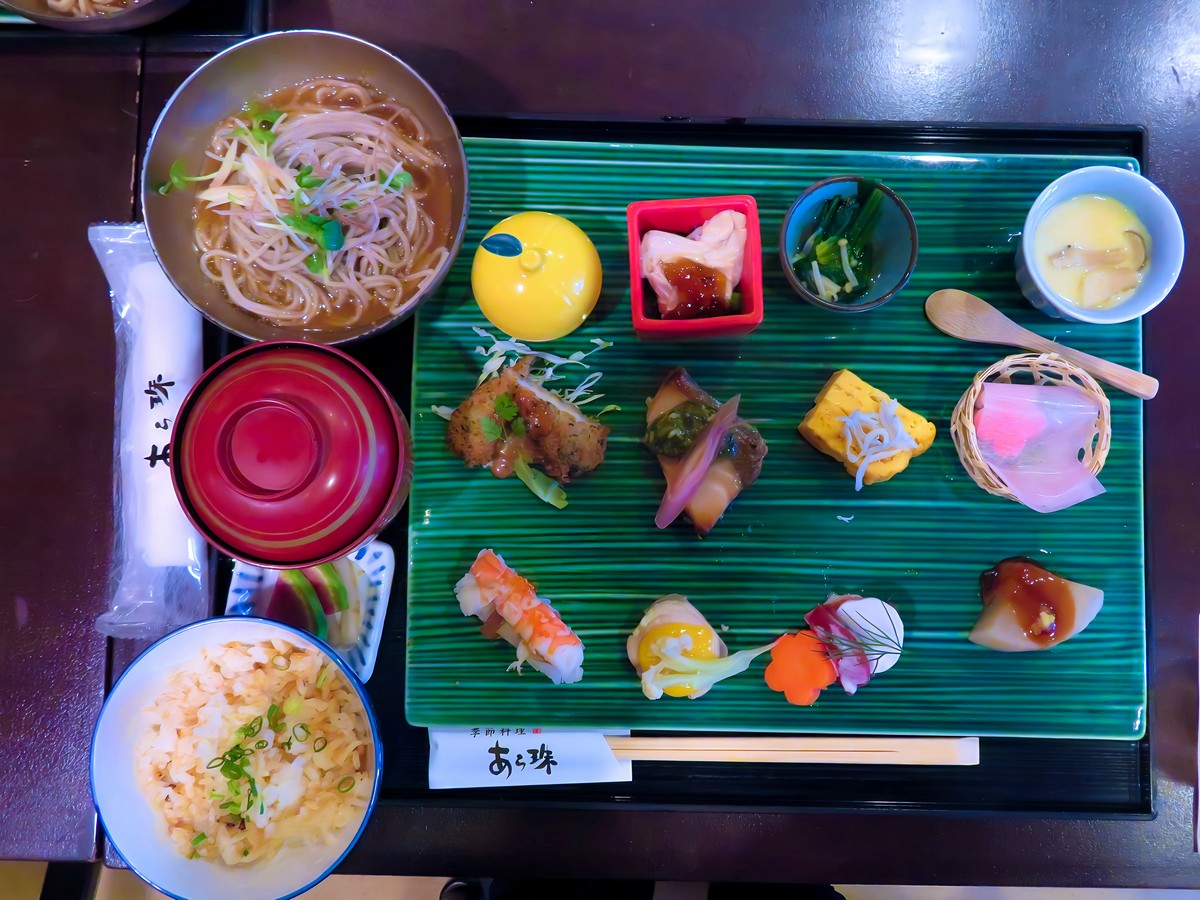 運ばれてきた料理は、炊き込みご飯に汁と香の物、そして蕎麦、これに一口サイズの料理が縦三つ横四つ12種に配置された大皿と、なかなか美的な盛り付けの盆。ただ、見た目に美的でも一口サイズとなるとリアルな食事としては心許ない雰囲気。さてさてどうなるやら・・・と。一同箸を付けランチスタートするに、これがなかなか美味い!部屋良し、料理良し、これでこの度のあらべい新年ランチは大成功!ということに。