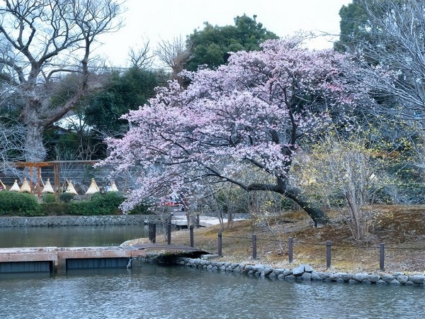 源平池を見渡すに、池の彼岸牡丹園辺りの湖岸に、全体にピンクの花をまとった大きな樹木と、その隣には黄色い花をまとった同様の樹木が。「・・・桜だ」、「いや、・・・梅だよ」と他愛のない結論のない会話。実情不明のままだが、この辺りは境内でも桜の名所になっているとか。