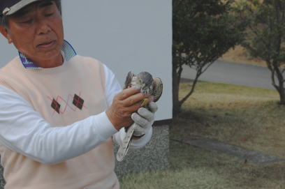 石塚氏が両手で持ち上げ、しばらくみんなでみていましたが、目はくっきりとみひらいていましたので、そっとふぉおりなげました。しかし、頭を打ってまだ完全に、さめきってないのか、低空飛行、つつじの枝にさわり、ちょっと先の芝生に着陸、じっとしてました。
