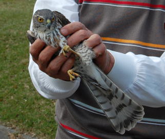 鷹の仲間の鳥だと、思いますが、名前はわかりません。今年生まれたような若鳥でした。きれいな緑の目、鷹様のくちばし、、可愛い、魅力的な色合いの鳥で、飼ってみたい、そんな感じ。