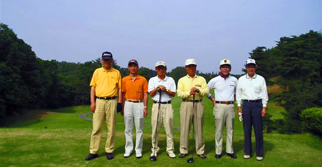 荒島君にも加わって貰い、8:30 7人は記念写真を撮り元気にスタートした。キャディーがいないのは少々寂しいが、緑濃いフェアウェーをカートで走り抜けるのはこれまた気分最高だ。