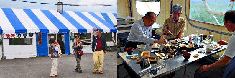 大きな焼きイカや牡蠣、ホタテ、近海の珍しい白身の魚、どれも美味しい北海道ならではの味で皆大喜び。どんぶり一杯の大飯もぺろりと平らげる。