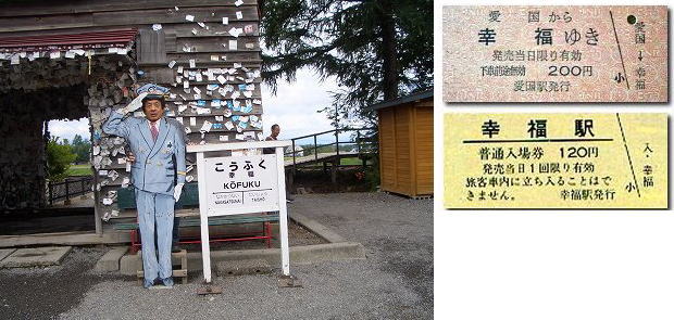 昭和48年(1973)NHKで北陸から入植した人たちの小さな幸せを綴ったドキュメンタリー新日本紀行「幸福への旅〜帯広」が放送され、幸福駅より二つ帯広駅寄りの愛国駅と併せて、「愛国から幸福ゆき」という切符が一大ブームとなり、前年には7枚しか売れなかった愛国−幸福間の切符が、この年は300万枚、4年間で1000万枚も売れたそうである。