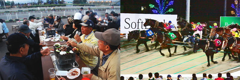 競馬場のコースのすぐ傍に、ジンギスカンのテーブルが何列もあり、大勢の人達が焼き肉を楽しみながら競馬を観戦していました。