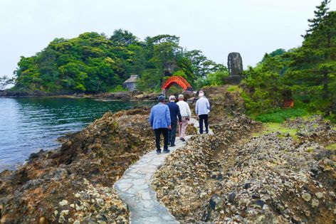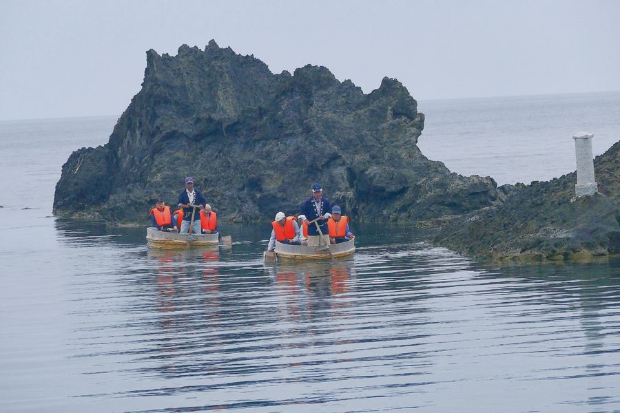 「たらい舟」は「はんぎり」とも呼ばれ、普通の樽を半分に切って舟にした由来によるとのこと。舟は心地よい海風を感じながら天然の岩礁を廻り、ゆったりとした一時を過ごすことができたが、岩礁そのものは1400万年前に出来た「水中火炎岩」で急激に落ち込む水中の深さを利用し「北前船」が停泊できたとのことで、随所に停泊用の杭(船つなぎ石)が残っていた。水中眼鏡から見た海の深さと歴史の深さを感じた「はんぎり」の乗船ではあった。