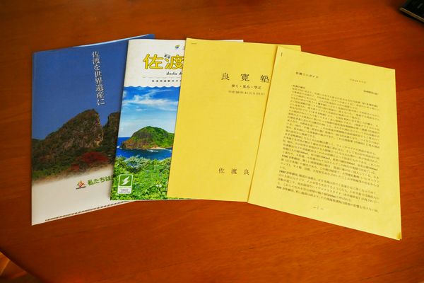 両津港に12:35分無事到着、早速、中川哲昌先輩の出迎えを受ける。お目にかかるのは、数十年ぶりであったが、お会いした瞬間、一気に現役時代の懐かしい会話に戻り嬉しい限りであった。先輩は我々の為に、綺麗な「佐渡を世界遺産に」のファイルの中に、「佐渡ミニガイド」「佐渡さんぽ」「良寛塾」などの自筆も含めた資料を用意して下さり、各人に握手と共に手渡してくれた。