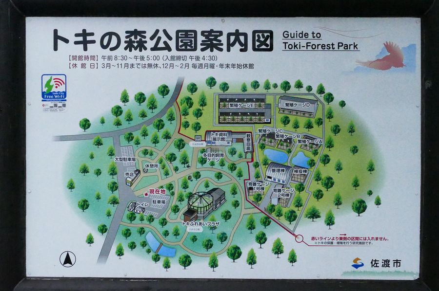 トキの森公園は、「資料館」「ふれあいプラザ」「保護センター」「多目的飼育ケージ」からなり、公園入り口には、「最後のトキ」である「キン」の石碑があった。
