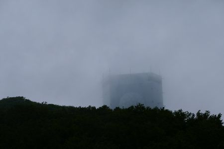 霧雨に煙る自衛隊のガメラレーダー 弁慶のはさみ岩