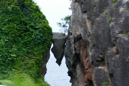 尖閣湾に移り「弁慶のはさみ岩」を見物。弁慶が金北山(1,172m)から投げて挟まったとの伝説。見事に挟まった岩に感動。