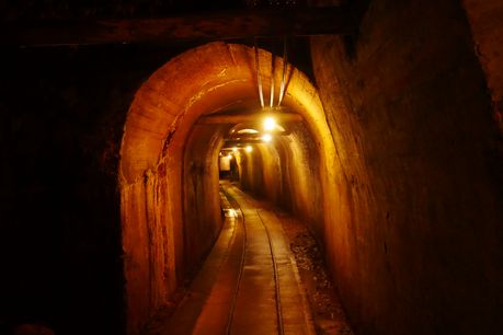 鉱石を積んだトロッコを牽引した蓄電池式機関車 恒温を利用した酒類貯蔵所