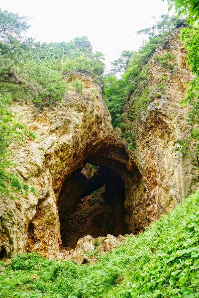 しばらくして出口があり、地上へ出る。暗さになれた目には新緑がまぶしい。左手には道遊の割戸が見える。