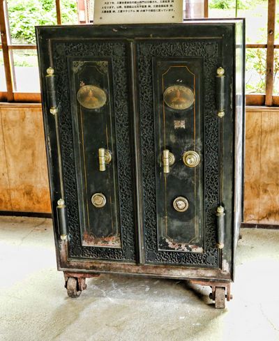 金の秤量に用いられた精密天秤 金を納めた金庫