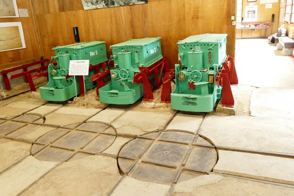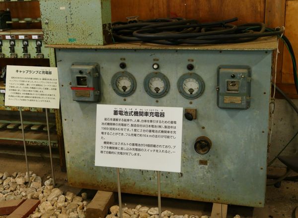 またトロッコを引く蓄電池式機関車の充電装置や、これらを工場から出し入れするのに使用したロータリー式の操車機(ターンテーブル)が残っていた。