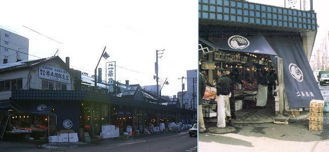 二条市場。蟹、蟹、蟹・・・、メロン、メロン、メロン、売り子の兄さん、おばさん、おじさん。