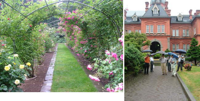 北大植物園のバラのトンネルと赤煉瓦北海道庁