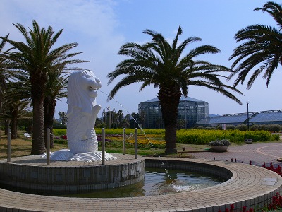 マーライオンの像はこの植物園がシンガポール国立植物園と提携した記念に飾られている。