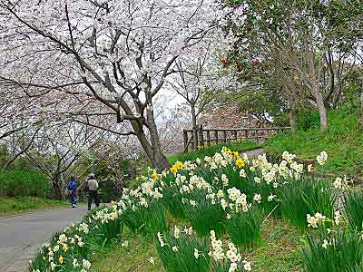 桜と椿を見ながら丘を下る。ちょうど昼飯の時間になったが、昼食場所はまだ先だ。