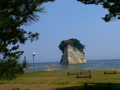 やがてバスは内浦の海岸に出ます。悲しい恋の物語が由来の恋路海岸を右に見ながら北上していくと海岸に軍艦が漂着しているように見える島(見附島という)が現れます。