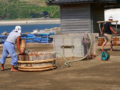 海岸から海水を桶に入れてくみ上げて塩田に撒き、しばらく放置して水分をある程度蒸発させた後、土ごと集めてきて塩田の真ん中にある濾過装置に入れて濾過させます。