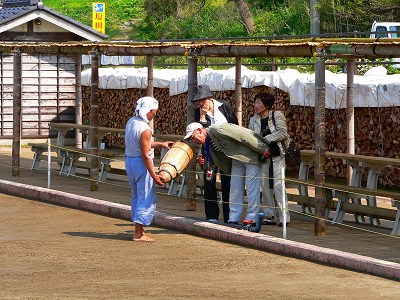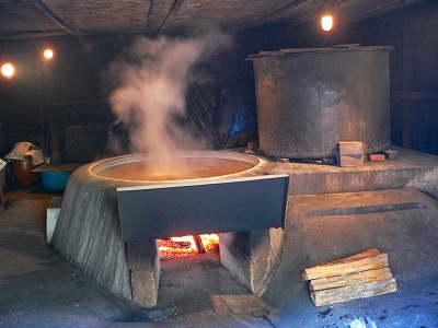 濾過装置にはフィルタがあり、土は通り抜けないようになっているそうです。フィルタを潜り抜けて凝縮された塩分水は、別の小屋にある直径1.5メートル位の釜で茹で、水分を蒸発させて塩の出来上がりとなります。