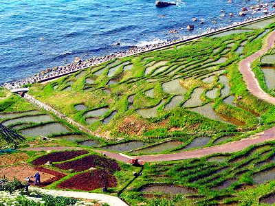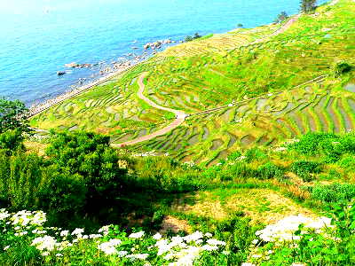 曽々木海岸から本日の宿泊地の輪島に向かう途中の海岸に約1万2000平方mの斜面に、1000余枚の小さな水田が幾何学模様を描いて並んでいます。階段状に作られたこれらの水田は、棚田に機械が入らないため、農作業はすべて地元住民とボランティアによる手作業の由。