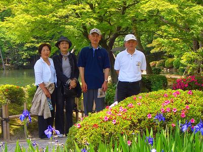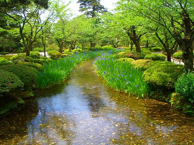旧県庁のシイノキの巨木を左に見ながら、広坂を歩き兼六園に入る。 ツツジやカキツバタが新緑に映えて美しい。