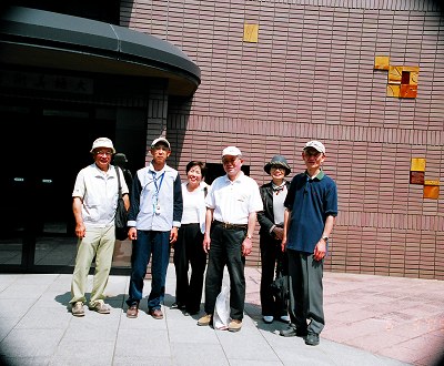 勅使河原 宏の設計になる「大樋美術館」前で記念撮影、「男衆」は伝統文化の茶道の奥の深さを、茶屋街に入る前に