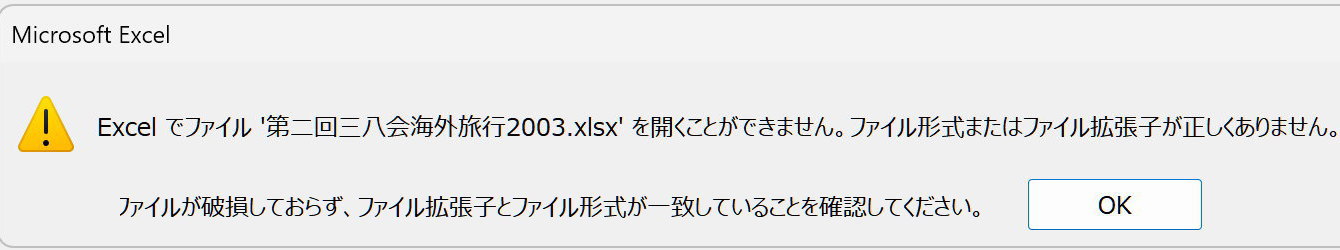 なお、第1図にある、小野さんが2002年に作製したExcelファイル「第二回三八会海外旅行2003」はMicrosoft Officeで開こうとすると、次のようなエラー表示が出て
