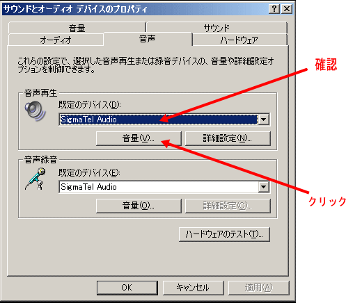 クリックすると下の画面になりますから、ここで「音声」タブを押します(WindowsXPの場合)
