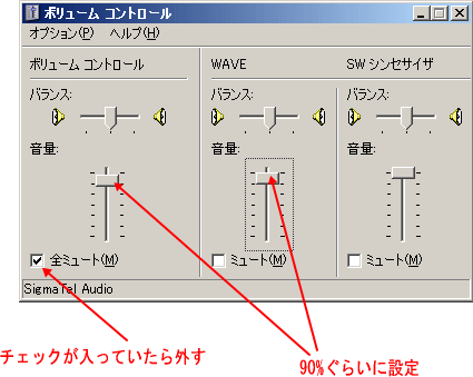 上の画面で「全ミュート」あるいは「ミュート」のチェックボックスにチェックが入っていたらこれを必ず全部外してください。
