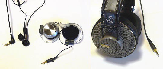 ヘッドフォンも下の写真に示すように、ピンからキリまでありますが、耳の穴に直接つっこむインナーイヤ型の安いもの(1,000円程度)で十分です。最近は携帯に便利な耳かけ式のもの(2,000〜3,000円)が出ていますがこれなら申し分ありません。