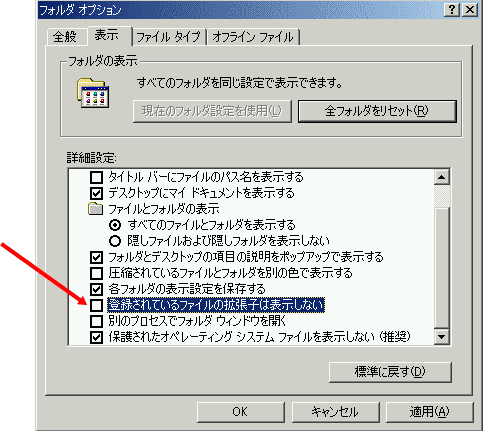 スタート→設定→コントロールパネル→フォルダオプション→表示と進んで、下のパネルで「登録されているファイルの
