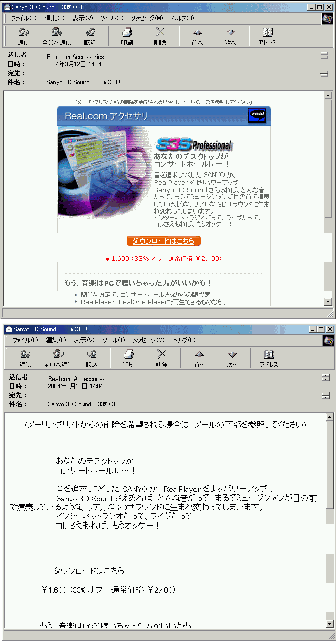 下にHTMLメールを本来の表示と、テキスト方式で表示した場合を比較してあります。