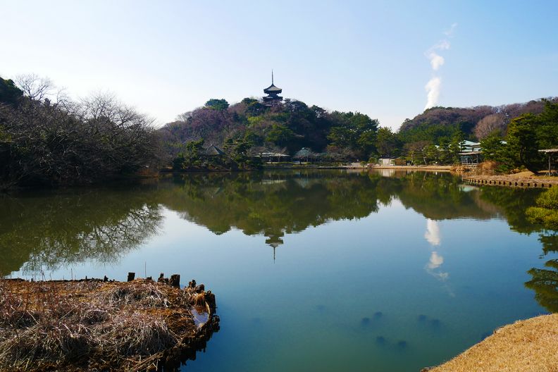 正門付近から三重の塔を望む、白煙は磯子火力発電所の水蒸気