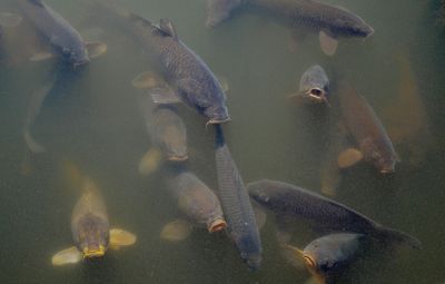 大池のほとりの道を歩くと、大きな鯉がエサを期待し、口を開いて浮かび上がってくる。