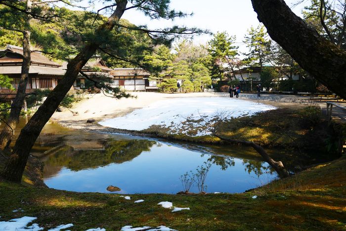 まだ雪が残る臨春閣の庭