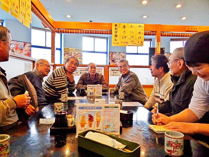 いよいよニコニコドライブインに到着、佐藤君とお店のおばさんとの駆け引きも有り、タイとヒラメの半分は刺身、半分は煮付け、真ん中は潮汁と決まった。「タイやヒラメの舞い踊り喰い」となった。