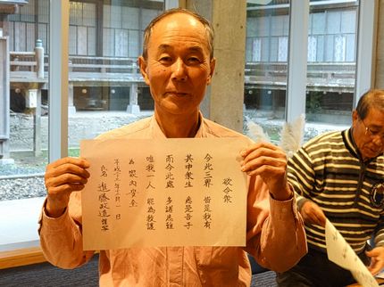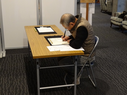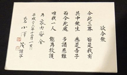 一番乗り(?) 書家の嗜みか、落款が押された小沢さんの書