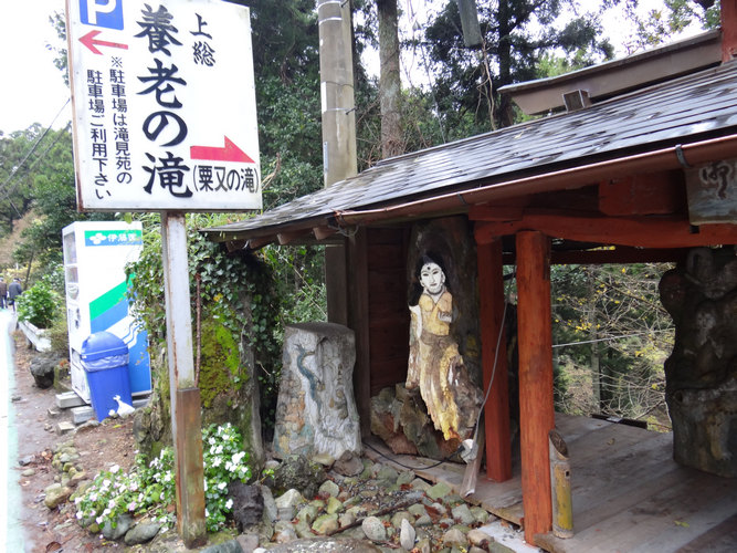 粟又の滝に到着。入り口には二年前と変わらずに、「怪しげな女人像」が誘うようにこちらを見ている。