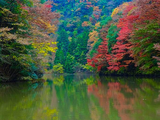 此処1−2日の雨で湖の水が濁って居たのが残念だったが其れでも水面に映る赤や黄色、緑は