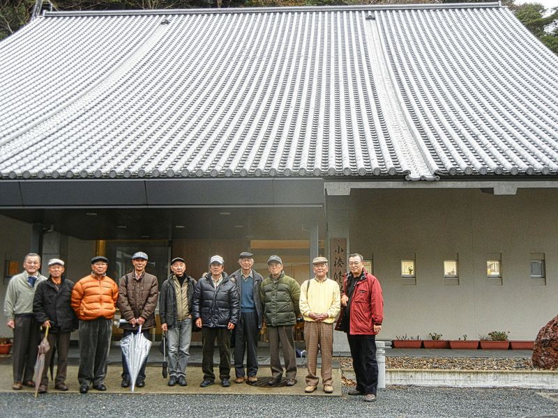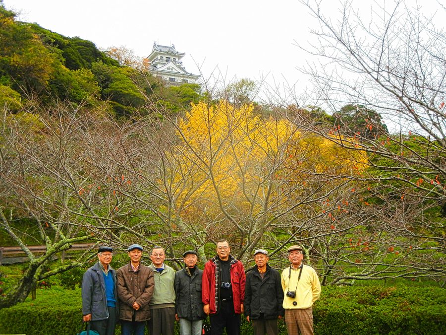 晩秋の館山城の下で記念写真、寒い!