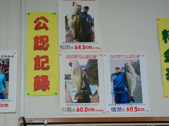 ボート店の壁に釣りの成果が貼ってあったがブラックバスの一番大きいのがなんと64センチ余り