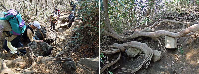 途中分岐点で金時神社コースを選んだ。相変わらず急斜面で木の根っ子がむき出しになっている。