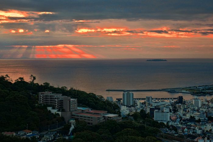 一夜が明け、久しぶりに痛飲したのに、朝6時過ぎに爽やかに目覚める。外を見ると雲間から朝日が熱海の海を美しく照らしている。
