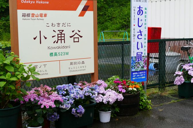 電車は3回のスイッチバックを行い、標高523メートルの小涌谷駅へ到着。さっきまで晴れていたのに暗くなり雨が